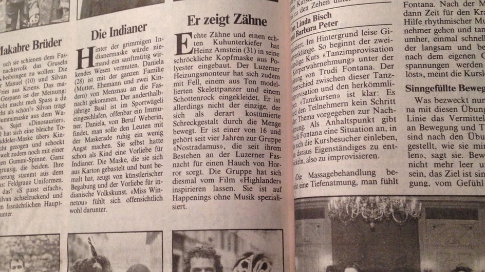 Wir schreiben das Jahr 1982, als Sigi Widmer, Bruno Gapp und Hugo Felix die Fasnachtsgruppe Nostradamus ins Leben gerufen haben. Als Gründungsort wurde das Atelier von Sigi Widmer an der Mythenstrasse in Luzern ausgesucht. Die drei eingefleischten Luzerner Fasnächtler waren allesamt in Guggenmusigen und suchten nach einer neuen Form, Fasnacht zu machen. Die Idee war schnell gefunden: Eine Maskengruppe ohne Instrumente soll es sein. Also keine Guggenmusig, sondern eine Gruppierung, die sich künstlerisch anspruchsvollen Sujets widmen soll. Somit gehören die Noster auch zu den Pionieren der sogenannten Kult-Ur-Fasnacht.